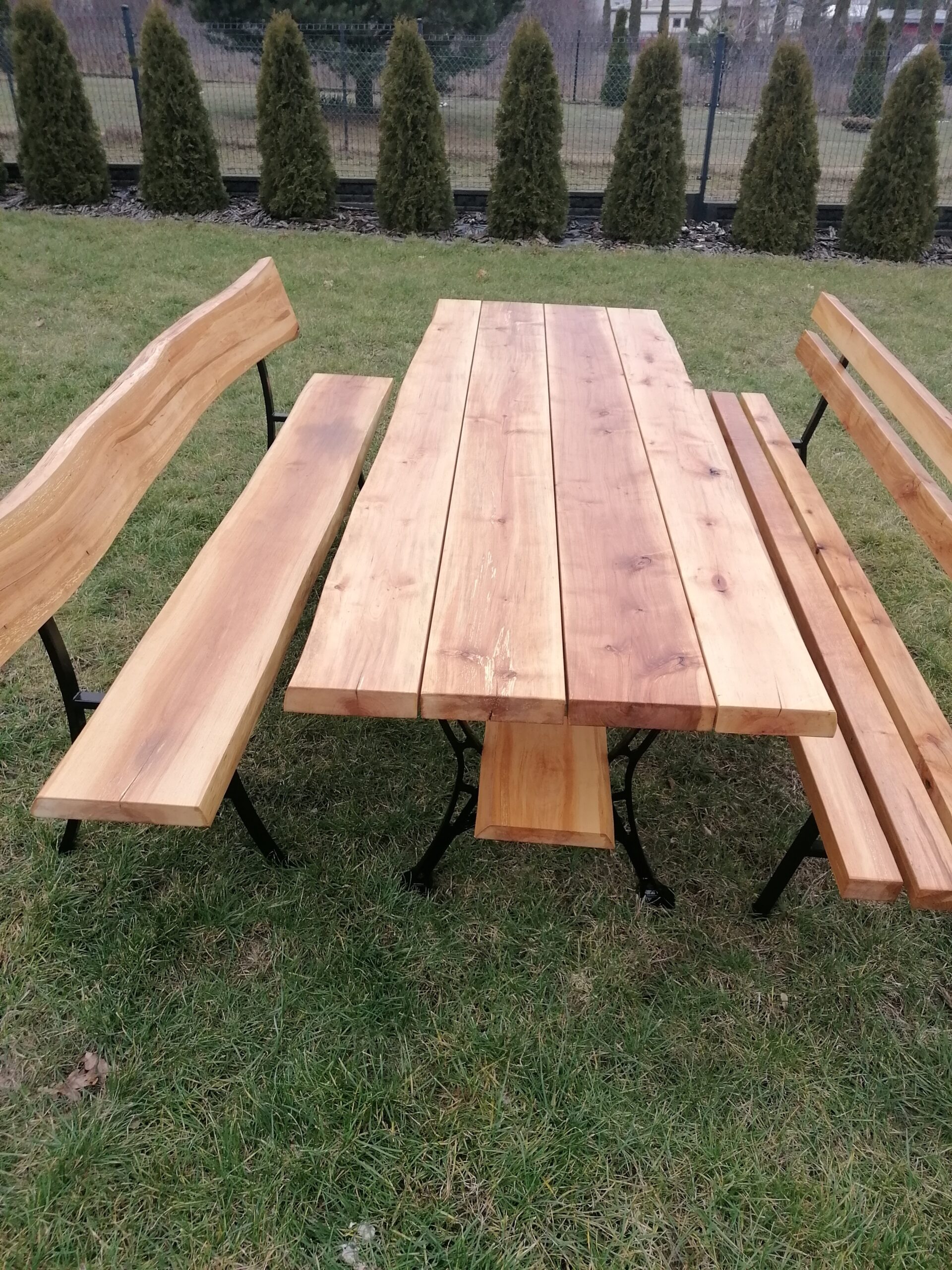 - Dwie rozcięte deski na siedzisku z naturalnym oflisem Ławki są również zamontowane na metalowych stelażach malowanych proszkowo w kolorze czarnym (wymiary: 220 × 35 cm).