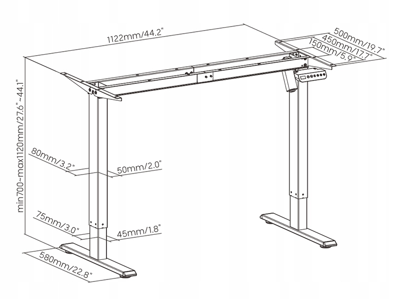 Do stelaża przymocujesz blat o szerokości od 120 do 150 cm oraz z głębokością 60-80 cm. Dzięki płynnej regulacji wysokości od 70 do 112 cm łatwo i szybko dostosujesz biurko do swoich preferencji a trzy banki pamięci w kontrolerze pozwolą Ci zapisać wysokości, z których najbardziej lubisz korzystać.